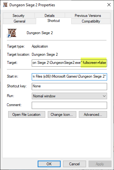 Change shortcut to have fullscreen turned off
