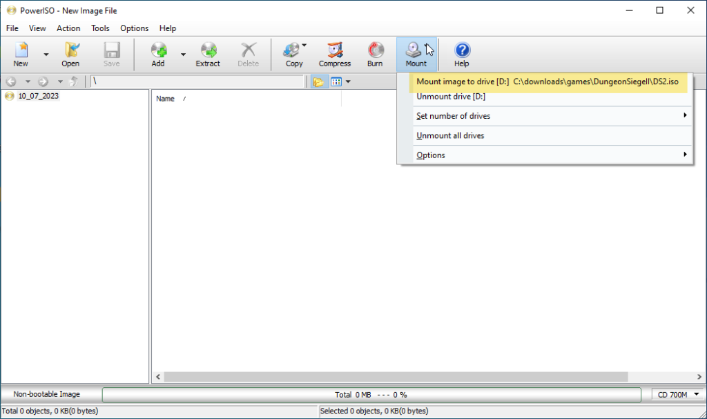 Once PowerISO is installed, click Mount and navigate to where you saved the Dungeon Siege .iso file.